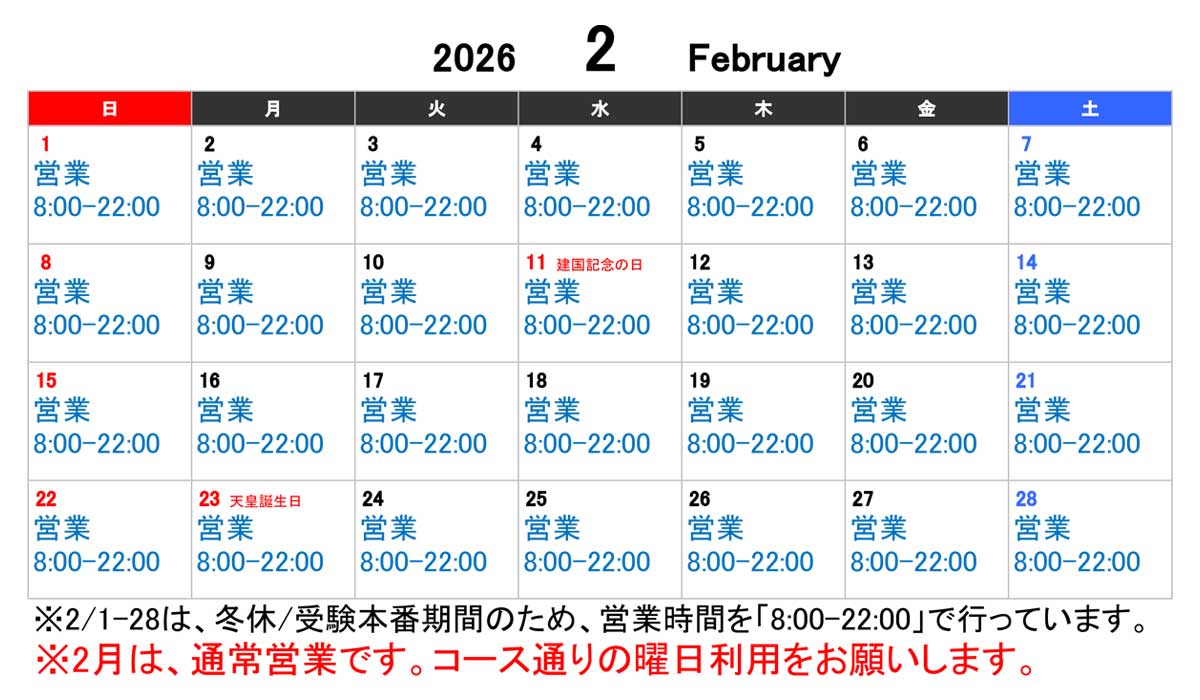 A. 中学生・高校生で利用時間が異なります。それぞれに「平日コース(平日15:00-22:00)」「土日コース(土日8:00-20:00)」「全日コース(平日土日両方利用可能)」があります。祝日や学校長期休暇(春夏冬休みなど)は、3つのコースの全ての会員は、8:00-20:00まで利用可能です。