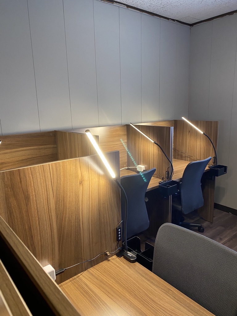 - 整頓消灯:自習机から離れる際は椅子を机に戻し、デスクライトは消してください