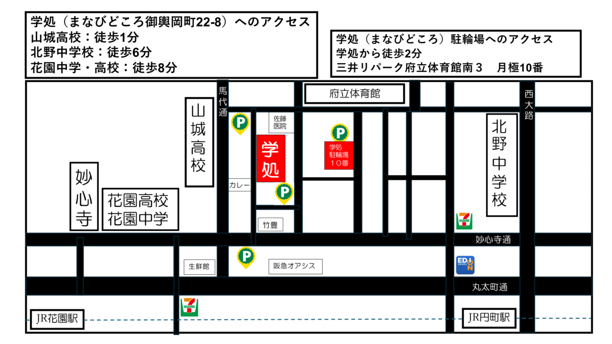京都市北区・右京区・中京区の学生に最適な立地、JR円町駅・花園駅徒歩圏内に位置し、山城高校、花園中学・高校、北野中学校などの学生さんが通いやすい場所にあります。